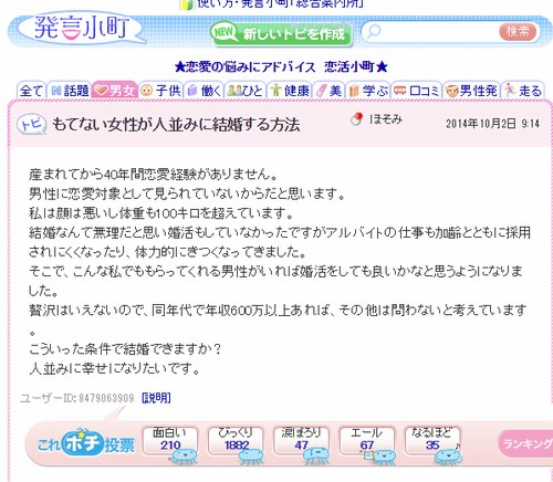 発言小町に投稿されたその悩みには「40年間恋愛経験がありません」としており、